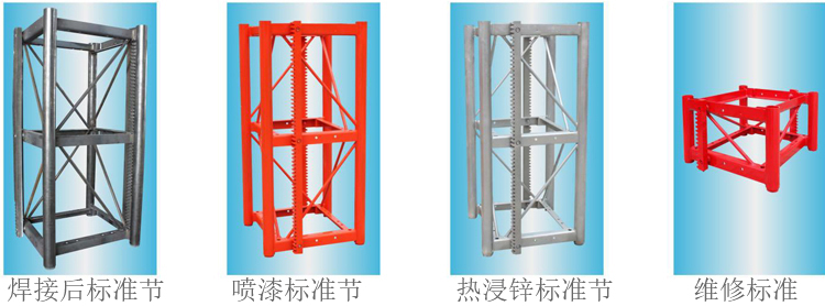 标準節選配:标準節規格650X650X1508,厚度爲4.5/6.3/8/10客戶可根據建築的高度選擇不同厚度的标準節。根據用戶需要,标準節表面可做噴漆處(chù)理或熱浸鋅處(chù)理(具有相對較高的強度和防腐性能)。齒(chǐ)條爲噴漆。
